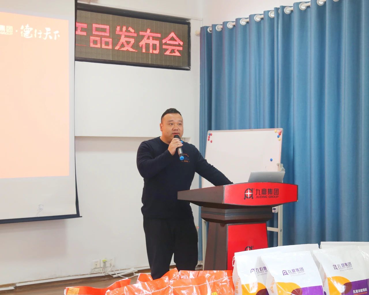 會(huì)議開始,集團(tuán)總裁喻文鋒先生、副總裁徐波先生及參會(huì)的集團(tuán)領(lǐng)導(dǎo)和各營(yíng)銷公司總經(jīng)理們一同登上講臺(tái),輕觸啟動(dòng)按鈕,隆重宣告預(yù)配料線超吉大系列新產(chǎn)品—超吉大教槽料、CJD優(yōu)乳寶、CJD仔豬寶的正式發(fā)布。