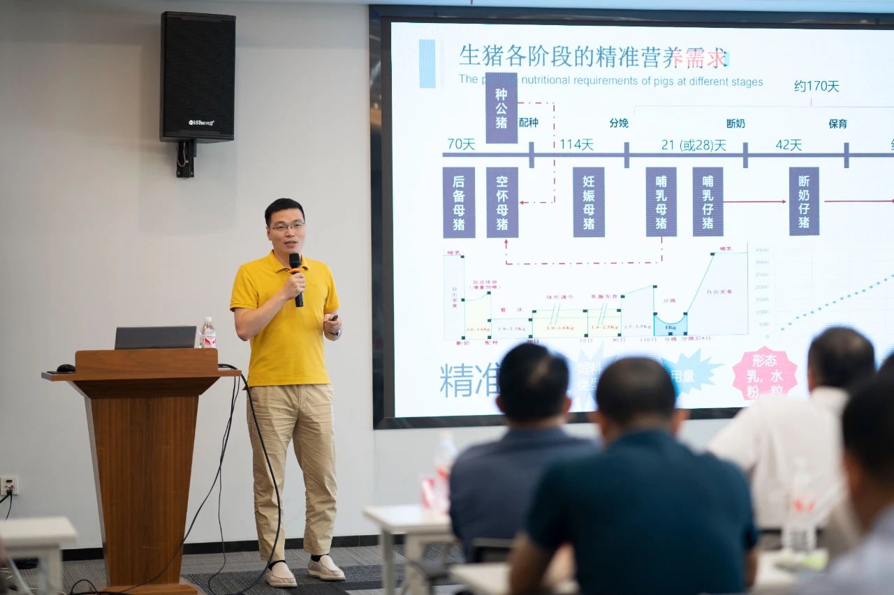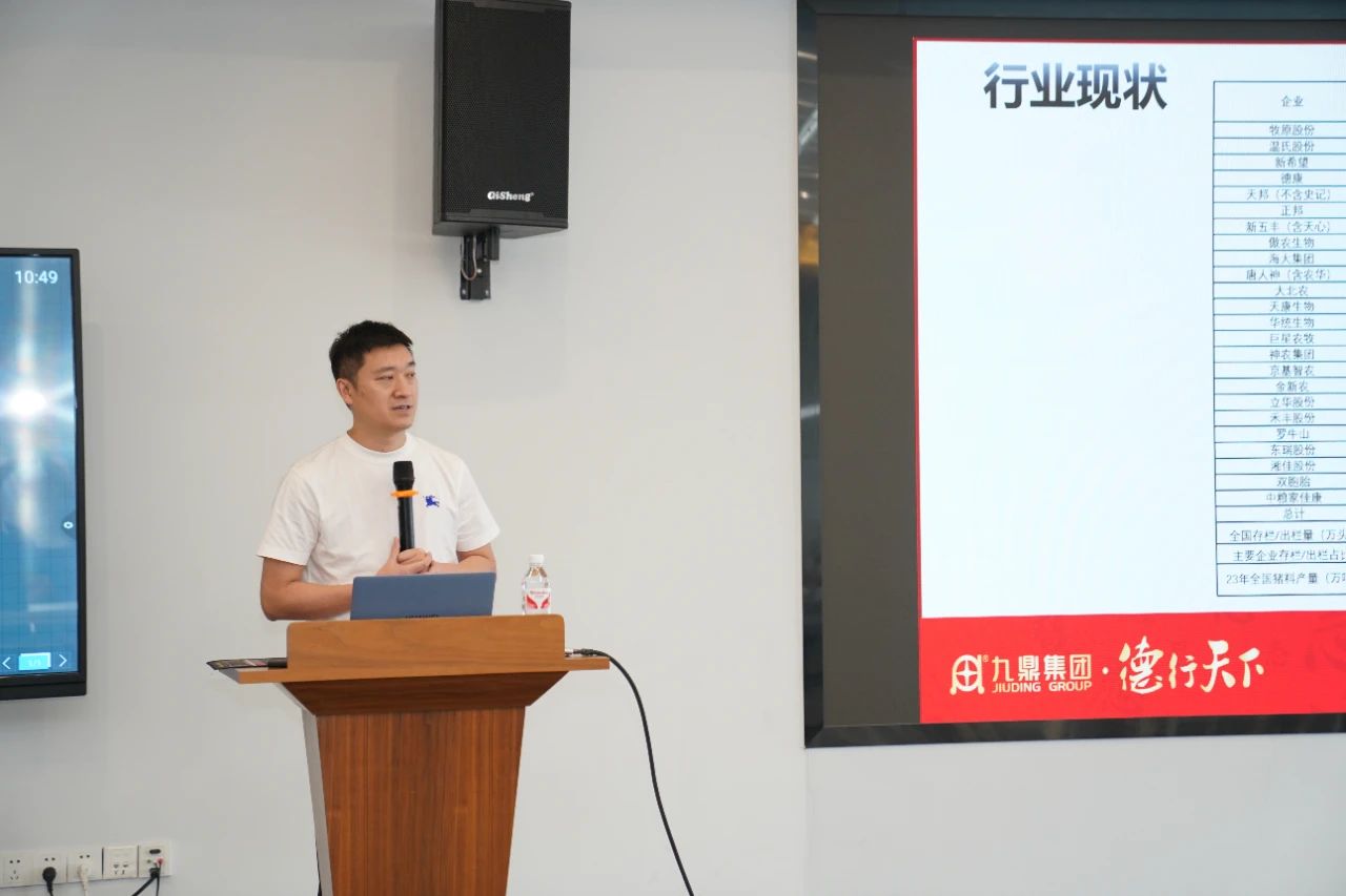 ▲集團研發(fā)中心總經(jīng)理江書忠介紹了《家庭農(nóng)場養(yǎng)豬E平臺》和《通過體況管理提升母豬生產(chǎn)成績》